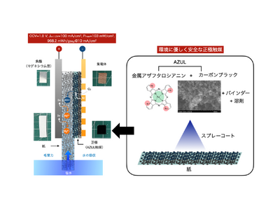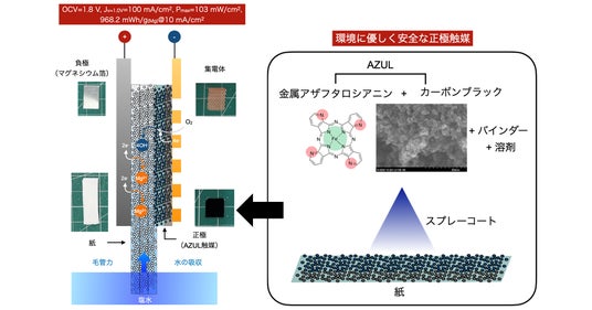 AZUL Energy(アジュールエナジー)、東北大学材料科学高等研究所の藪浩教授、電力中央研究所の小野新平上席研究員、Amphico Ltd(英国ロンドン、亀井潤社長)からなる研究グループは、燃料電池と金属空気電池の一種であるマグネシウム空気電池を、資源豊富な紙・マグネシウム・炭素をベースにレアメタルフリーかつ安全なAZUL触媒を使用して作製し、1.8Vの電圧、100mW/cm2以上の高出力、968.2Wh/kg (Mg)の高容量を実現しました。この電池は環境にやさしい素材で構成されており、中性の電解液である塩水などに浸すことで発電することができます。そのため、非常用電源やウェアラブル端末への適用が可能です。