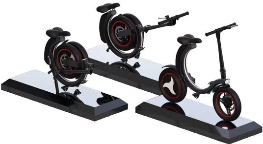 - 一般的な電動キックボードは折り畳むことが出来てもハンドル部分が折り畳める程度ですが、湾曲した車体を活かしタイヤサイズまで折り畳むことを可能にしました。走行モード・ドラッグモード・円形モードの3形態に変形可能で、状況に応じて使い分けることが可能です。