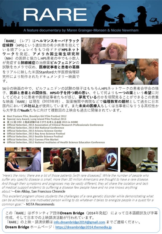 Dream Bridge(以下、DB)と株式会社ピアハーモニー(以下、ピアハーモニー/本社:東京都練馬区、代表取締役社長:深井祐太)は、「ヘルマンスキー・パドラック症候群(HPS)」という非常に「レア(稀)」な疾患を抱えて生きる患者と家族、臨床試験に臨む医師の姿を描いたドキュメンタリー映画である「RARE」を、難病患者とそのご家族向けに初上映したことを発表いたします。