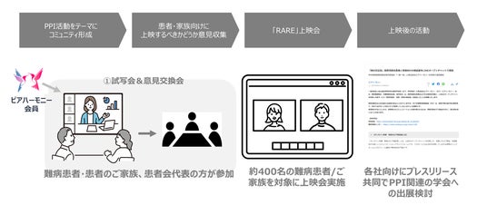 - ピアハーモニーとのエンゲージメントが高い信頼できる少人数の患者・ご家族のコミュニティを形成し試写会と意見交換会をおこなう