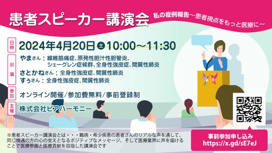 ※「患者スピーカー講演会」は、難病や希少疾患を抱える患者さんが自らの経験を語ることで、同じ境遇にある人々に心の支えとなるポジティブなメッセージを送り、同時に医療業界にもその声を届けることを通じて医療参画と医療貢献を目指す講演会です。