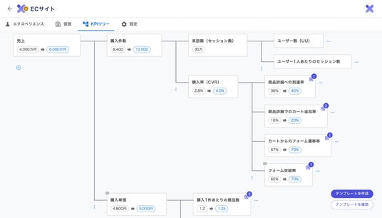 Webサイトの目標を細分化して、KPIツリーを作成。テンプレートからの複製も可能。