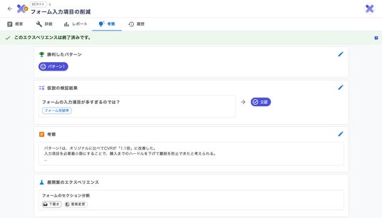 テスト結果のレポートからパターンの勝者を決定し、検証対象の仮説が正しいと言えるか判定。考察の記入や、展開案として新たなABテスト施策を紐付けることも可能。