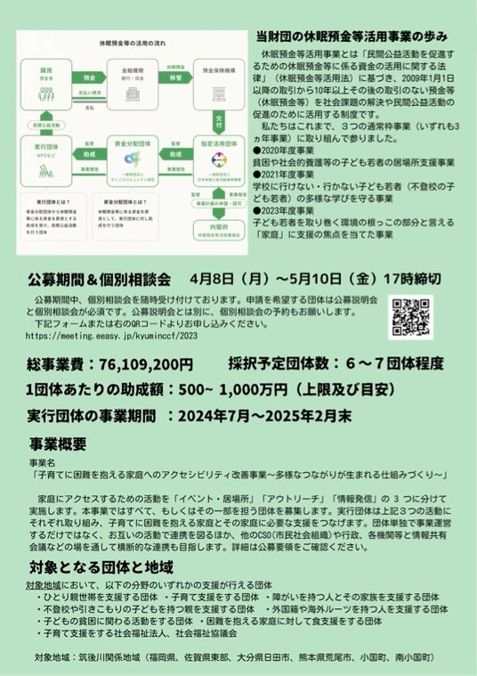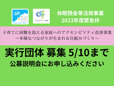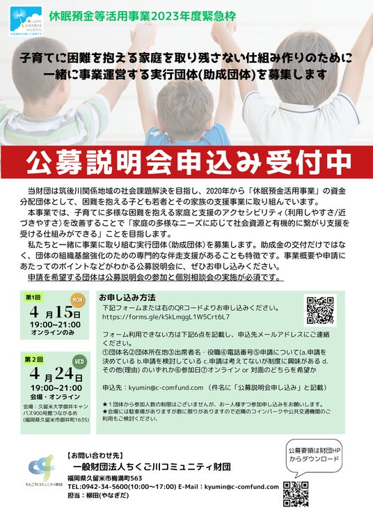 一般財団法人ちくご川コミュニティ財団(福岡県久留米市)は、2023年度緊急枠(第4次)の休眠預金等活用法に基づく資金分配団体に採択されました。私たちと一緒に事業に取り組む実行団体(助成先)を5月10日まで募集します。