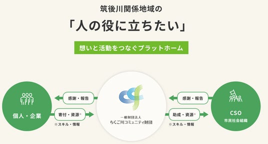 一般財団法人ちくご川コミュニティ財団は、2019年に福岡県で初めて市民が立ち上げたコミュニティ財団です。九州最大の河川「筑後川」が流れる関係地域で、NPOなどの市民活動に取り組む方々をサポートする中間支援組織として、資金面・非資金面の両面から伴走支援活動をしています。