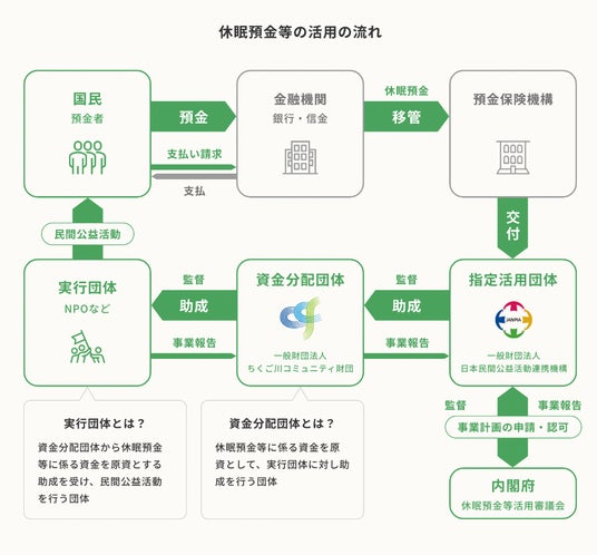 「民間公益活動を促進するための休眠預金等に係る資金の活用に関する法律」(休眠預金等活用法)に基づき、2009年1月1日以降の取引から10年以上、その後の取引のない預金等(休眠預金等)を社会課題の解決や民間公益活動の促進のために活用する制度が2019年度から始まりました。