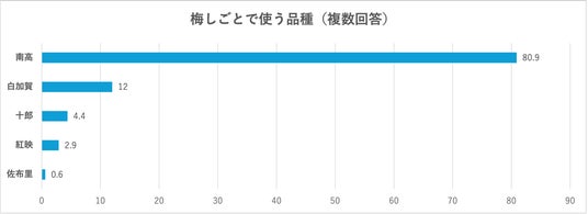 梅しごとで使う品種を聞いたところ、「南高梅」が80.9%と人気で、以降は、「白加賀梅」(12%)、「十郎梅」(4.4%)と続きます。「スーパーで買うと品種が書いておらずよく分からない」という声もありました。