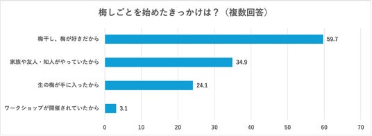 梅しごとを始めたきっかけは、「梅干し、梅が好きだから」が59.7%と半数以上を占め、「家族や友人・知人がやっていたから」が34.9%、「生の梅が手に入ったから」が24.1%と続きます。「自分好みに漬けられる」というのは、梅好きにとって梅しごとにおける最大のメリットかもしれません。