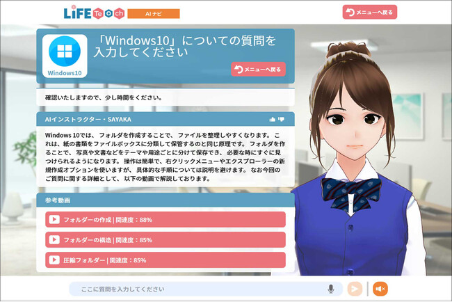 ChatGPT技術を用いたAIインストラクターが、学習者の質問に即座に応答し、適切な解決策や映像教材を提供します。
