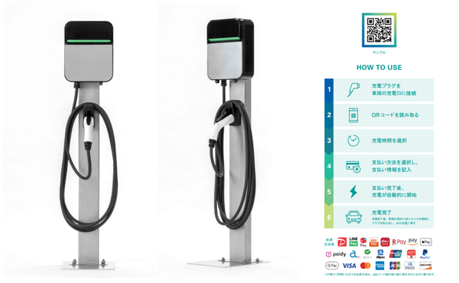 専用のEV充電カード発行やアプリ登録の手間なく、QR決済を通じて普段お使いのクレジットカードやPAY払いが可能で、利便性も高いサービスとなります。