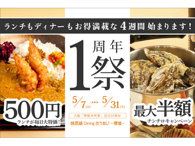 大阪 堺筋本町駅にある活貝居酒屋『焼蒸鍋Dining おうめい-嚶鳴-』では、2024年5月7日(火)~5月31日(金)まで、昼も夜もお得になる1周年記念イベントを開催いたします。
