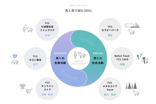 TCC Japan は馬のまち栗東(滋賀県栗東市)を活動拠点とし、引退競走馬の支援活動を行う「TCC 引退競走馬ファンクラブ」や、引退競走馬をパートナーとしたホースセラピーなどの社会活動を通じて、人馬のソーシャルイノベーションに取り組んでいます。
