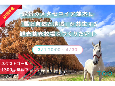 クラウドファンディング 目標金額1000万円を達成し、4月30日(火)までネクストゴール1300万円に挑戦中!TCC Japan が絶景観光地「メタセコイア並木」×「馬」の共生を形にします。