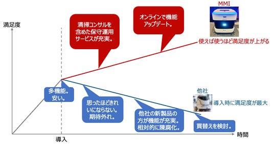 MMIはすでに2023年度には50台の清掃ロボットを導入し、パチンコ最大手のマルハンをはじめ、総合スーパーなどの自社清掃現場に投入しました。これにより、清掃ロボットの最大の課題である安定的な稼働と高い稼働率を実現しました。2024年度にはさらに1000台の清掃ロボットを導入する予定であり、清掃のロボティクス分野における先駆者として、
