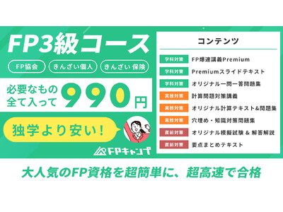 今回開講するFPキャンプ3級コースは、「FPに興味があるけど何から勉強したらいいかわからない」、「勉強する範囲が広すぎてどこがポイントなのか分からず途中で挫折する」、「聞いたことがない単語・たくさん出てくる数字に混乱」、「分厚いテキスト、1周終わる前に挫折」といったFP3級受検生が抱える悩みを解決するオールインワン学習コンテンツ。