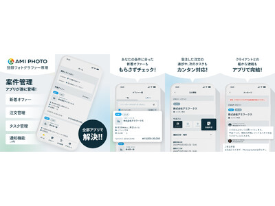 今回リリースしたアプリにより、「AMI PHOTO」の登録フォトグラファーは、撮影リクエストの新着オファーや注文管理、確認作業や通知機能(リマインダー)、メッセージ機能などの業務をアプリから一元管理できるようになりました。