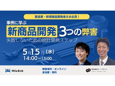 金属加工特化のBtoBマッチングプラットフォーム「めたまっち」を運営する株式会社ミラリンク(本社:福岡県北九州市、代表取締役:佐取直拓、以下ミラリンク)は、新商品開発を行うメーカー担当者様へ向けた無料セミナーを、株式会社C.Iプラント(本社:愛知県豊橋市、代表取締役会:西郷幸市、以下C.Iプラント)と開催いたします。
