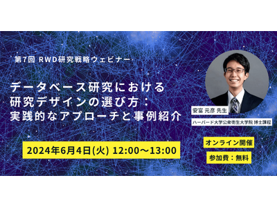 株式会社データック(東京都千代田区、代表取締役兼医師 :二宮 英樹、以下:データック)は、第7回RWD研究戦略ウェビナー「データベース研究における研究デザインの選び方:実践的なアプローチと事例紹介」と題した無料オンラインセミナーを、2024年6月4日(火)12時より開催いたします。