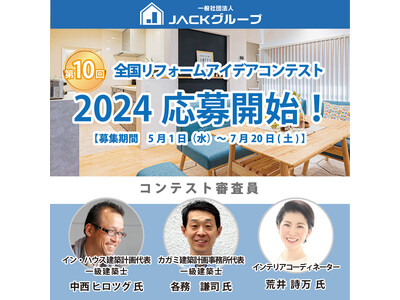 一般社団法人Jackグループ(代表:蜘手 健介)は今年も「全国リフォームアイデアコンテスト」を開催決定いたしました。各社の熱のこもったレベルの高い設計力の作品を集めることで、リフォーム業界の提案力の底上げを図るとともに、現場で働く担当者のモチベーションにつながれば、という思いから始まったコンテストです。リフォーム会社、住宅会社、不動産会社、一般の方、どなたでも応募可能。開催10回目を迎える本年は2024年5月1日(水)から7月20日(土)まで応募を受付けています。