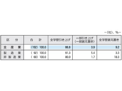 東証プライム上場企業152社の速報集計。「全学歴引き上げ」は86.8%、大学卒の水準は23万9078円