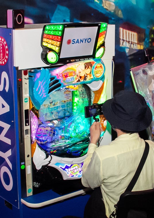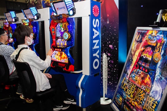 ブースの中でもひと際目を引いたのは、「超巨大海物語」体験コーナー。ホールで好評稼働中の「P大海物語5」を忠実に再現した遊技台は、全長なんと2.5メートル! その大きさに興味を持ったパチンコビギナーやノンユーザーが大当りを手軽に楽しめるように、大当り確率は50%に設計。参加者たちは巨大な液晶を祈るような表情で見つめ、大当りしたときには笑顔がこぼれていました。