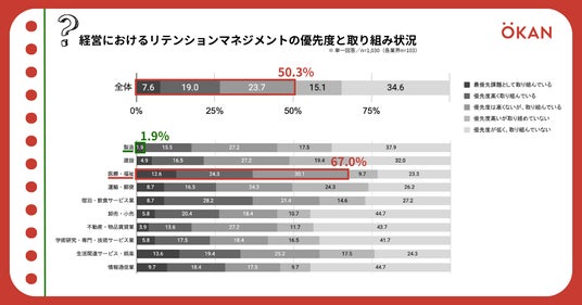 「取り組んでいる」と答えた経営者は全体の50.3%・医療・福祉業界では67.0%- 業種別で見ると、リテンションマネジメントについて「最優先課題として取り組んでいる」と答えた割合が
