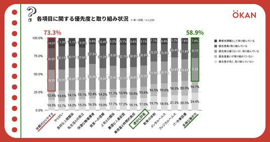 Q2で尋ねた15要素について、会社での優先度と取り組み状況について尋ねたところ、「取り組んでいる」と答えた経営者が最も多かったのは「休暇のとりやすさ」で全体の73.3%でした。続いて「やりがい(72.7%)」「良好な人間関係(71.7%)」「私生活との両立(71.7%)」「快適な職場環境(71.3%)」の順に取り組んでいる経営者が多い結果となりました。