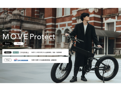 「MOVE Protect Basic」(引受会社:三井住友海上火災保険株式会社)は、MOVE製品ご購入者全員に1年間無償で付帯自転車搭乗中の傷害死亡・後遺障害、日常生活賠償、盗難補償を提供。「MOVE Protect Plus」(引受会社:SBI日本少額短期保険株式会社)は、充実した車両破損や100%の盗難補償等を追加できる任意保険。(MOVE Protect: https://move-ebike.co.jp/pages/move-protect )