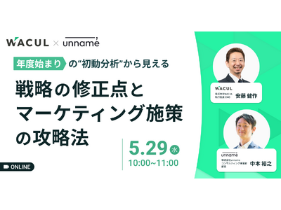 マーケティングの側面から事業成長を支援する株式会社unname(本社:東京都渋谷区、代表取締役:宮脇 啓輔、以下「unname」)は、株式会社WACUL(本社:東京都千代田区、代表取締役社長:大淵 亮平、以下「WACUL」)と共催で、5月29日(水) 10時より、無料オンラインセミナー「年度始まりの”初動分析”から見える戦略の修正点とマーケティング施策の攻略法」を開催します。(申込先:https://unname.co.jp/btob-marketing/seminer/240529)