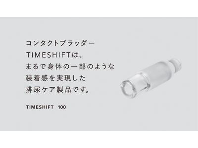 「TIMESHIFT」は、漏れた尿を一旦製品本体に貯め、普通のトイレで、通常通り用を足すように捨てることができる革新的な男性用尿失禁(尿もれ)ケア製品です。製品カテゴリーの「コンタクトブラッダー」とは、コンタクトレンズのように身体に付けて使う膀胱(ブラッダー)という意味です。意図せず流れる尿を外に漏らさず第二の膀胱であるコンタクトブラッダー「TIMESHIFT」で受けることで、そもそも、『尿もれ』という概念そのものをなくす製品です。