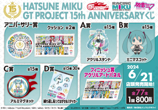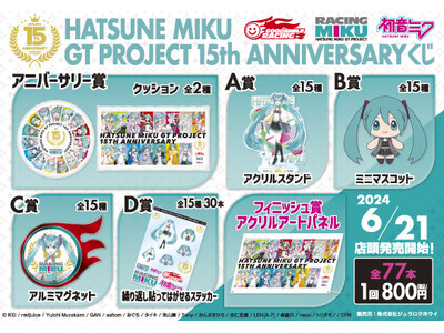 株式会社ジュロクホウイ(本社:東京都千代田区、代表取締役:赤松 武雄)は、2008年に「ファンと共に走るレーシングチーム」として発足した初音ミク GTプロジェクト15周年を記念した、『初音ミクGTプロジェクト15周年記念くじ』を2024年6月21日(金)に、ローソン・書店・ホビーショップなどで発売致します。