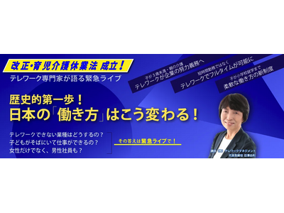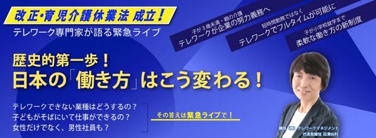 本日5月24日、改正・育児介護休業法が成立しました。株式会社テレワークマネジメント(以下、テレワークマネジメント 本社:北海道北見市 代表:田澤由利)は、法案成立に伴い、緊急ライブを配信します。