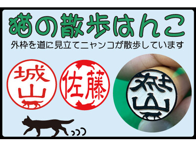 株式会社 城山博文堂では、ハンコの外枠を道に見立て、そこを散歩する猫をデザインした「猫の散歩はんこ」を5月27日に発売しました。猫とハグする日(6月4日)を見据えた、猫系デザイナーズ印鑑です。