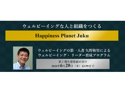 株式会社ハピネスプラネット(東京都国分寺市、代表:矢野和男)は、ウェルビーイング・リーダー育成プログラム「Happiness Planet Juku」をリリースし、第1期生の募集を開始したことをお知らせいたします。本プログラムは、約2ヶ月間で、ウェルビーイング施策で効果をあげるための「周囲を巻き込み熱を伝播して推進する人財」を養成することを目指します。さらに、受講者の皆様限定のネットワークを築くことができます。