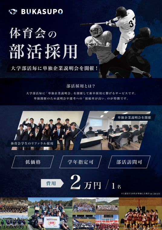 株式会社部活メディア(本社:東京都千代田区)は、体育会学生の新卒採用サービス『部活採用』をリリースいたしました!大学部活毎に「単独企業説明会」を開催して部員にインターンシップや選考の案内ができます。