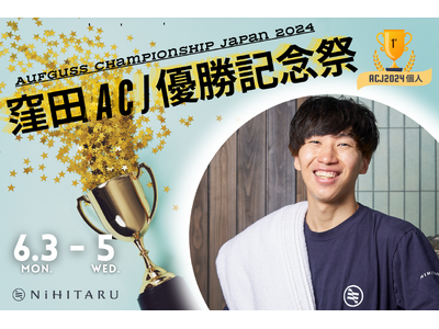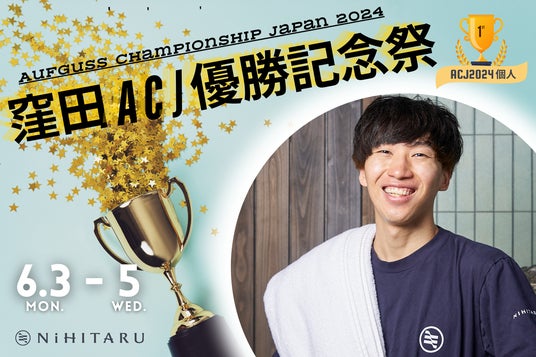 合同会社NiHITARU(本社:東京都江東区、代表社員:水上 瞳)は、サウナ施設「sauna&bath NiHITARU」所属のアウフグースマスター・窪田(のこのこ窪田/KuBOTARU)のACJ(アウフグース・チャンピオンシップ・ジャパン2024)での個人部門の優勝を記念して、2024年6月3日(月)~5日(水)の3日間、「窪田ACJ優勝記念祭」を開催します。