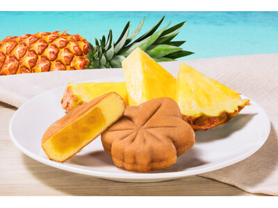 餡は、白あんベースにパイナップルのペーストを合わせ、ジューシーなパイナップル果肉のダイスカットを入れて食感を楽しめるようにしています。生地にもパイナップルのペーストを入れて風味付けし、ふっくらと焼き上げました。