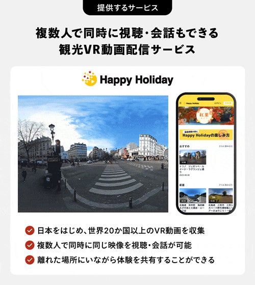 「HappyHoliday」の特徴は、自宅やオフィスなど場所を問わず好きな方と好きな時間に複数の人で世界中の観光旅行を体験できることです。