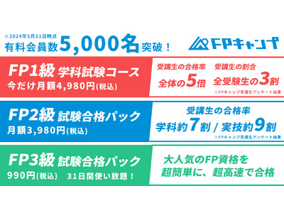 FPキャンプは本質を理解する学びの楽しさを感じながら、最短合格に向けて効率的に学習できるサブスク型オンラインFP資格スクール。2023年7月にFP1級学科試験コース、同年12月にFP2級コース、2024年4月に3級コースを開講。昨年7月の開講から11か月間で全コースの有料受講者数が累計で5,000名を突破しました(内訳:1級学科試験コース2,300名超、2級コース2,500名超、3級コース200名超)。
