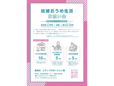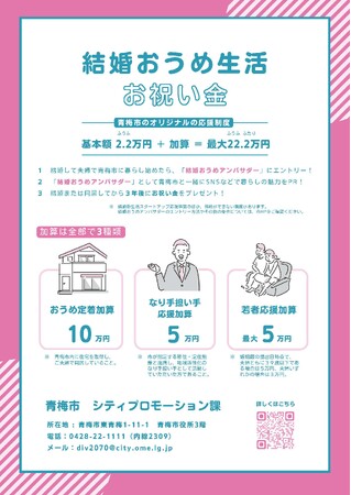 このたび、「新婚ご夫婦を幅広く応援する青梅市でありたい」、そんな思いから青梅市独自の取組として、新婚さん応援制度第2弾「結婚おうめ生活お祝い金」を開始いたしました!