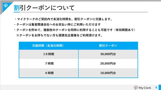 - MyClerkの利用時間をクーポン券に換えて集客サービスの充当することが可能