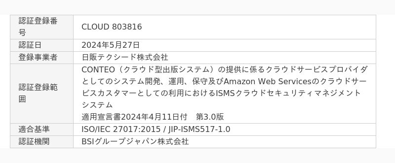 日販テクシード株式会社(本社:東京都中央区、代表取締役社長 藤澤 徹、以下日販テクシード)が開発・販売する出版業・コンテンツビジネス業管理システムCONTEOが、2024年5月27日付でクラウドサービスセキュリティの国際規格「ISO/IEC 27017」の認証を取得しましたことをお知らせいたします。
