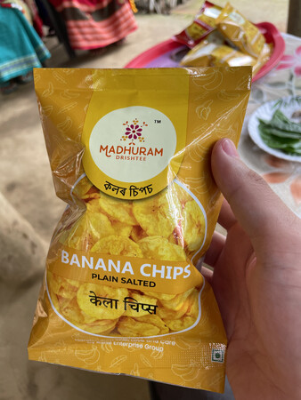 バナナチップスの生産はアッサム州で活動するDrishteeというNGOが担っている。Drishteeは田舎の女性グループを組織し、バナナチップスの生産を行っている。結び手がバナナチップスを買い取ることで、生産元の女性たちの経済的自立を支援することにもつながる。