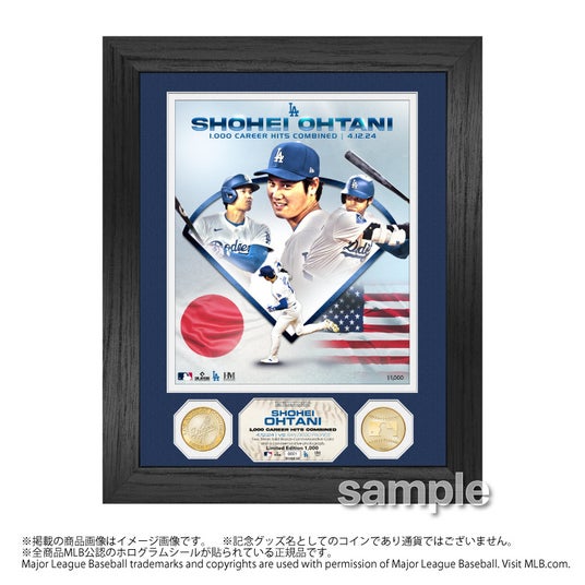 大谷翔平選手の日米通算1000本安打の偉業を記念したメモリアルグッズになります。大谷翔平選手の勇姿と日米の国旗イメージがコラージュされた、大変珍しいデザインです。ドジャースロゴとMLBロゴがデザインされたプレミアムコインが付属します。