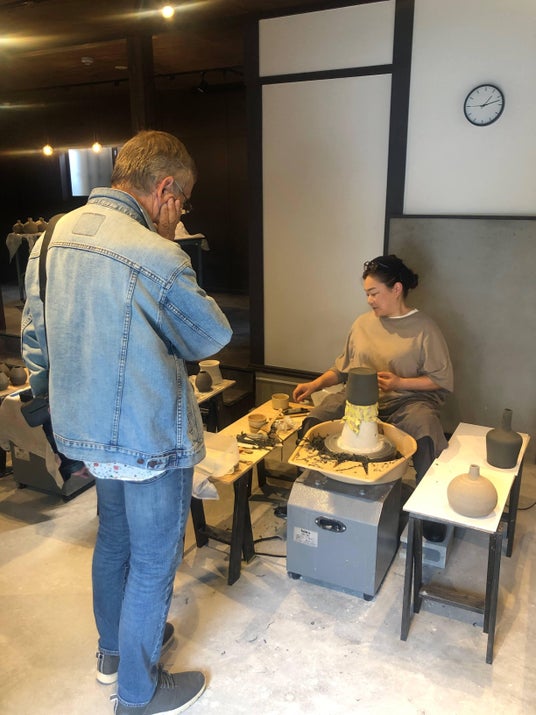 作陶工房ではロクロ成形をしばらくご覧になられていました。@at Kiln MINO Ceramics Studio