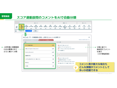 しかし、特にサーベイ実施人数が多い企業ではフリーコメントの回収量も増加し、内容の確認や分類に多くの時間を要することが課題となっていました。従業員の意見や改善案などを人事施策へ迅速に繋げやすくすることを目指して、このたびAIを活用した「スコア連動設問」のフリーコメント分類機能を新たに開発いたしました。