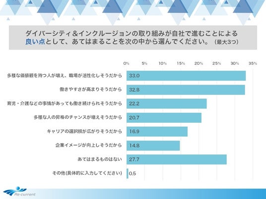 「D&Iの取り組みが自社で進むことによるよい点」について複数選択形式で聞いたところ、トップに「多様な価値観を持つ人が増え、職場が活性化しそうだから」、次いで「働きやすさが高まりそうだから」が挙がりました。
