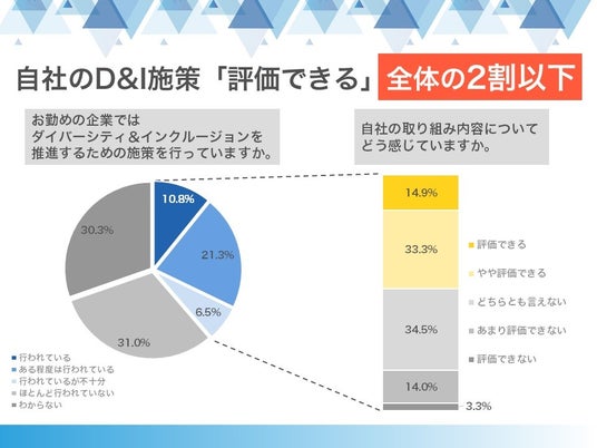 - D&I推進実施企業のうち「施策を評価できる」回答者は半数を切り、全体の2割以下に