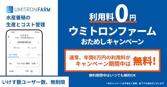 2024年12月末までの利用料を無料にて提供する「ウミトロンファームおためしキャンペーン」を実施します。サービスのフィードバックを収集し、最大限の改善を行うため、ぜひ一度無償でご利用いただき、ご意見をお寄せください。※2※1 今後、一部の発展的な機能はオプション機能として、追加料金が必要となる形で提供する可能性がありますが、基本的には必要な機能を最低限の料金で利用可能なプランと、発展的な機能を追加料金にて利用できるプランを用意する方針で開発を進めてまいります。