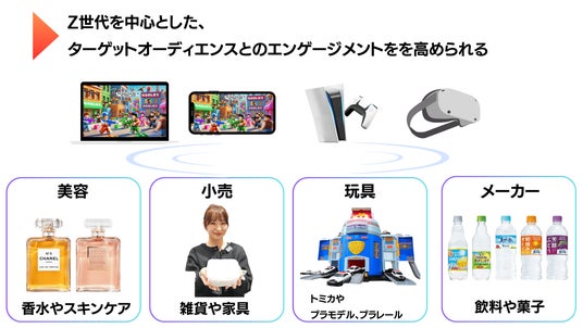 Robloxは、美容、小売、玩具、食品メーカーといった様々なジャンルの体験に対応できます。ブランドや商品を題材にしたオリジナルのゲームやイベントを企画・運営、小学生や中高生をはじめとしたZ世代へに対して、ブランド認知と顧客購買エンゲージメントを高めることが期待できます。